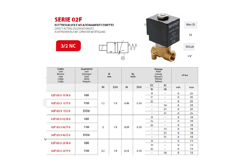 Priamo riadený ventil s funkciou 3/2 NC (3 úlohy, 2 cesty, v základnom stave zatvorený ventil). Základná, mechanická časť "Solenoidu priem. 13 mm" je určená pre cievku rovnakého priemeru otvoru "13 mm". V základnom stave "NC" je prietok média obmedzený otvorom za závity "2 IN" [mm]. Ovládaním elektrického solenoidu sa prietok zväčšuje do jeho maxima, ktoré je v tabuľke uvedené ((vo farebnom (inom) odlíšení). Hodnoty delta prietoku a delta tlaku je možné vyhľadať v originálnom katalógovom liste výrobcu. Výber cievok: Podstatným údajom pri výbere solenoidu je prietok, vŕtanie a sila cí. riadi otvorenie do max. výtupu (1 OUT), kde je pre všetky typy rovnaké vetranie 1,9 mm, viď originálny katalóg Riedke médiá: Maximálna viskozita média je uvádzaná 53°.