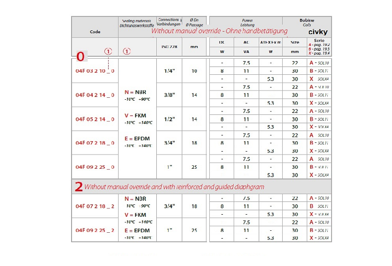 Skrátená poznámka: Cievka solenoidu sa musí objednať zvlášť, Séria typ A, B a X