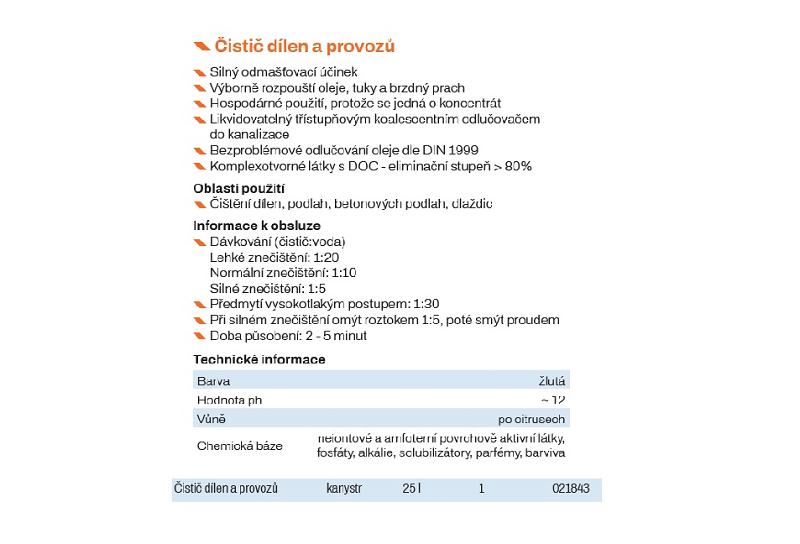 Koncentrát, žltá kvapalina - čistenie dielní, podláh, betónových podláh, dlaždíc. Vonia po citrusoch. Rozpustný a riediteľný vo vode, bod vzplanutia +181°C, hustota 1050 kg/m3. Nie je výbušný! Prednosti produktu: Silný odmasťovací účinok, výborne rozpúšťa oleje, tuky a brzdový prach. Likvidovateľný trojstupňovým koalescentným odlučovačom do kanalizácie, bezproblémové odlučovanie oleja podľa DIN 1999. Komplexotvorné látky s DOC - eliminačný stupeň > 80%. Likvidácia podľa úradných predpisov. Nesmie sa likvidovať spoločne s domácim odpadom. Nesmie preniknúť nezriedený alebo nezneutralizovaný do odpadových vôd resp. do odpadového zberača.