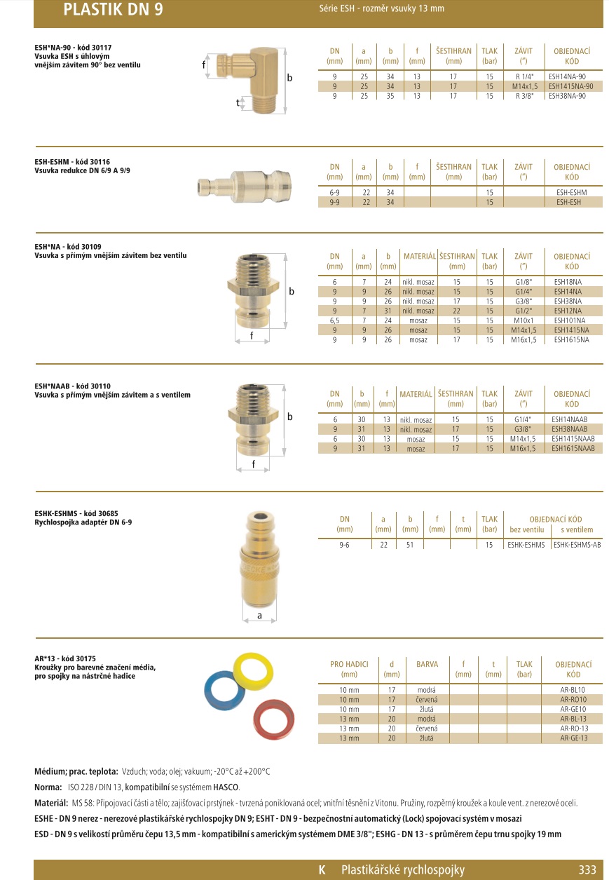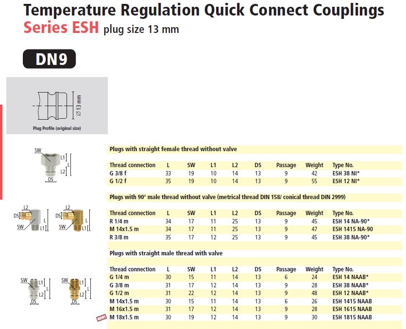 Rýchlospojky určené pre plastikárske stroje a formy s voľným priechodom. Na aplikácie udržanie stále teploty horúcou a studenou vodou, poprípade temperovacím olejom. Kompatibilný s Hasco Z8. Mosadzné telo, a objímka, vnútorná časť z nerezovej ocele, tesnenie viton. Vsuvka Dn 9 s priamym vonkajším závitom, s ventilom. Vnútorný kužeľ DIN 3863. Dn9 - rada ESH Lüdecke uvádza okraj rozmer čapu 13mm, cez výtupky čapu nameriate 13,4 mm.