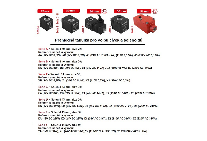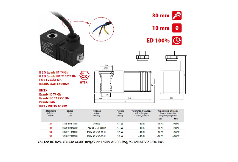 3 pinové kolektory, 3 m farebných káblov. Trieda klasifikácie cievky: H podľa EN 60085, tiež ATEX II 2D Ex mb IIIC T135 ° C Db. Ostatné normy a špecifikácie viď katalóg (obrázky pri výrobku). Spojenie so solenoidmi je voliteľné viď tiež referencie cievok ... XB, X1, X2, X3