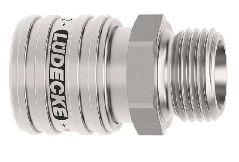 Rýchlospojka z nerezovej ocele 1.4305 s vonkajším závitom, séria Dn 7,2 jednostranne uzatvárateľná. Nerezové rýchlospojky tejto série ESE DN 7,2 majú priemer nasadzovacieho čapu 12 mm. Rýchlospojka s ergonomickou objímkou - vrúbkované majú lepší úchop a nešmýkajú sa. Na prívod stlačeného vzduchu pri zvýšenej čistote a hygienických predpisoch alebo pri doprave rôznych médií (plyny, chemikálie, laky, farmaceutiká). Niekoľko oblastí použitia vo farmácii, chemickom priemysle, lekárskej technike, potravinárskom priemysle, čistých priestoroch aj pre sofistikované pneumatické aplikácie. Rýchlospojky majú prietok 1150 l/min aj pri nízkom tlaku a majú minimálny odpor prietoku. Možnosť na objednanie aj rýchlospojky pre kvapaliny obojstranne uzatvárateľné (-AAB). Materiál: Teleso, objímka, telo ventilu, ventil, kolíky, kolko: nerezová oceľ 1.4305. Pružiny, poistný krúžok: nerezová oceľ 1.4310, tesnenie FKM (Viton).