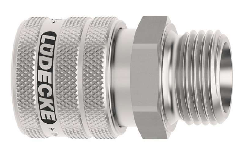 Rýchlospojka z nerezovej ocele 1.4305 s vonkajším závitom, séria Dn 7,2 jednostranne uzatvárateľná. Nerezové rýchlospojky tejto série ESE DN 7,2 majú priemer nasadzovacieho čapu 12 mm. Rýchlospojka s ergonomickou objímkou - vrúbkované majú lepší úchop a nešmýkajú sa. Na prívod stlačeného vzduchu pri zvýšenej čistote a hygienických predpisoch alebo pri doprave rôznych médií (plyny, chemikálie, laky, farmaceutiká). Niekoľko oblastí použitia vo farmácii, chemickom priemysle, lekárskej technike, potravinárskom priemysle, čistých priestoroch aj pre sofistikované pneumatické aplikácie. Rýchlospojky majú prietok 1150 l/min aj pri nízkom tlaku a majú minimálny odpor prietoku. Možnosť na objednanie aj rýchlospojky pre kvapaliny obojstranne uzatvárateľné (-AAB). Materiál: Teleso, objímka, telo ventilu, ventil, kolíky, kolko: nerezová oceľ 1.4305. Pružiny, poistný krúžok: nerezová oceľ 1.4310, tesnenie FKM (Viton).