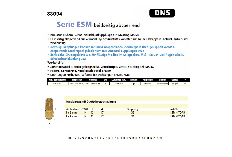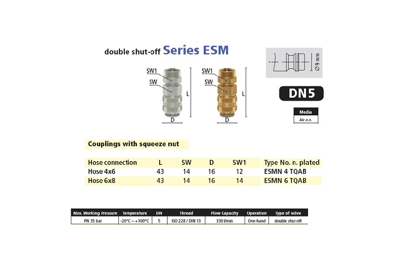 Jednoručný rýchlospojkový systém DN 5 s priemerom čapu 9 mm z mosadze MS 58. Robustný a bezpečný systém Push-On zaistenia hadice do 35 barov. Od roku 2018 sú všetky verzie DN 5 vyrábané aj s niklovaným povrchom ESMN.