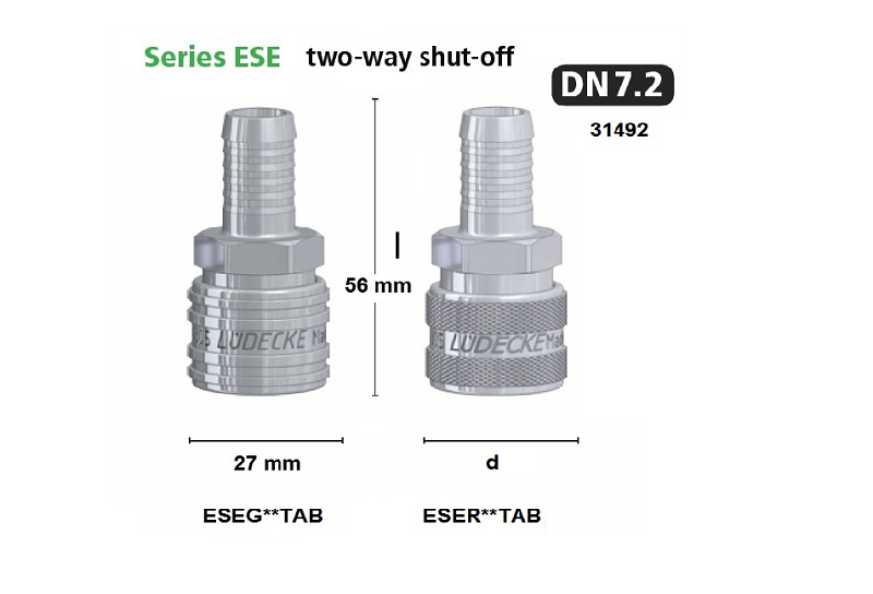 Ludecke rýchlospojka tŕň z nerezovej ocele 1.4305, séria Dn 7,2, obojstranne uzatvárateľné. Rýchlospojky majú prietok 660 l/min. aj pri nízkom tlaku a majú minimálny odpor prietoku. Nerezové rýchlospojky tejto série ESE DN 7,2 majú priemer nasadzovacieho čapu 12 mm. Niekoľko oblastí použitia, najmä pre kvapalné médiá v stavbe zariadenia, meracie a regulačné technológie, farmácie, lekárske technológie, chemický priemysel, potravinársky priemysel a tiež na zvýšenie čistoty a hygienických predpisov. Dvojité vypnutie, aby pri odpájaní nedošlo k úniku média. Spojky je možné pripojiť pomocou priamych zástrčiek DN 7,2. Dvojité uzatváracie zátky však nemôžu byť spojené so štandardnými spojkami DN 7,2. Materiál: Teleso, objímka, telo ventilu, ventil, kolíky, kolko: nerezová oceľ 1.4305. Pružiny, poistný krúžok: nerezová oceľ 1.4310, tesnenie FKM (Viton).