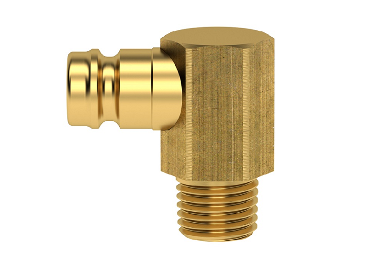 Rýchlospojky určené pre plastikárske stroje a formy s voľným priechodom. Na aplikácie udržanie stále teploty horúcou a studenou vodou, poprípade temperovacím olejom. Kompatibilný s Hasco Z8. Mosadzné telo, a objímka, vnútorná časť z nerezovej ocele, tesnenie viton. Vsuvka Dn 9 Plastik 90° s vonkajším závitom bez ventilu (metrický závit podľa DIN 158/ kužeľový závit podľa DIN 2999).