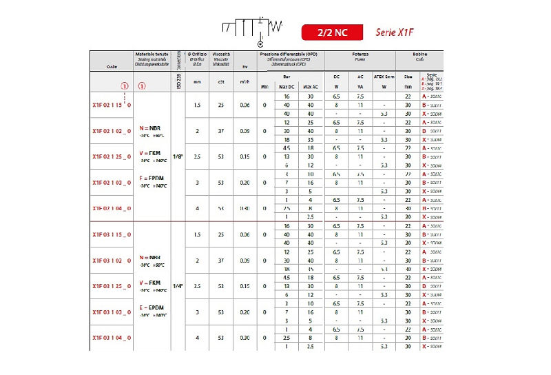 Pre výber vhodného Solenoidu je potrebné zvážiť 6 hlavných parametrov: 1. Napätie, 2. Výkon (W), 3. Riadený prietok (m3/hod.), 4. Typ otvorenia (NC/NO - v základe uzavretý/otvorený), 5. Tesnenie podľa 3 druhov voči médiu napr.: NBR - horúca voda a para. 6. Priemer solenoidového hriadeľa (táto rada 01F má 10 mm). Palivá sú: minerálne oleje, benzín, nafta, vykurovací olej a pod. Vŕtanie DN (JS) vykazuje tabuľkovo tieto prietoky: DN 1,5 = 60 l/hod. (1 l/min.), DN 2 = 90 l/hod., DN 2,5 = 150 l/hod., DN 3 = 200 l/hod., DN 4 = 300 l/hod.