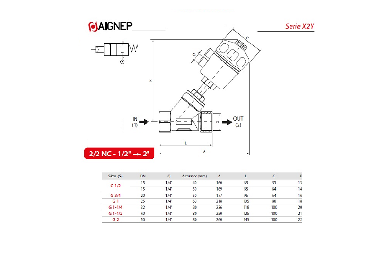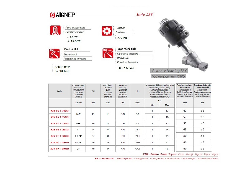 Piest vo vnútri pohonu je mechanicky spojený k uzáveru cez driek, ktorý umožňuje otvorenie alebo uzavretie hlavného otvoru v telese ventilu pre priechod tekutiny. Pri neprítomnosti riadiaceho tlaku zostáva ventil v uzavretej polohe vďaka pružine. Prívodom vzduchu do riadiaceho vstupu sa ventil sa otvorí. Ventily s uhlovým sedlom radu X2Y zaručujú veľký prietok, nízke trenie a zabránenie vodnému rázu vďaka vstupu prietoku pod sedlom. Viskozita kvapalín tohto výrobku je uvádzaná v hodnote 600 l/hod. (cSt) pre všetky DN.