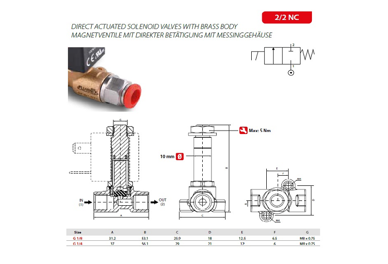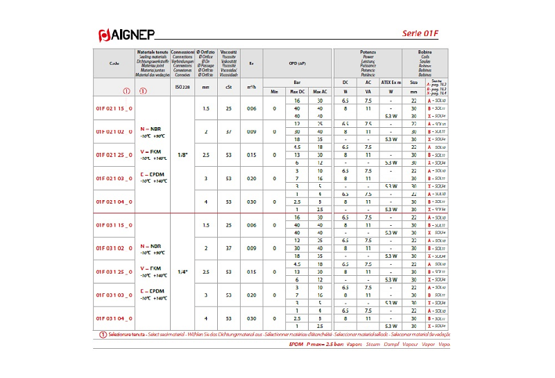 Pre výber vhodného Solenoidu je potrebné zvážiť 6 hlavných parametrov: 1. Napätie, 2. Výkon (W), 3. Riadený prietok (m3/hod.), 4. Typ otvorenia (NC/NO - v základe uzavretý/otvorený), 5. Tesnenie podľa 3 druhov voči médiu napr.: NBR - horúca voda a para. 6. Priemer solenoidového hriadeľa (táto rada 01F má 10 mm). Palivá sú: minerálne oleje, benzín, nafta, vykurovací olej a pod. Vŕtanie DN (JS) vykazuje tabuľkovo tieto prietoky: DN 1,5 = 60 l/hod. (1 l/min.), DN 2 = 90 l/hod., DN 2,5 = 150 l/hod., DN 3 = 200 l/hod., DN 4 = 300 l/hod.