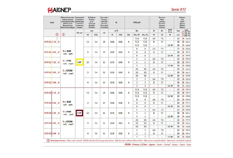 Pre výber vhodného Solenoidu je potrebné zvážiť 6 hlavných parametrov: 1. Napätie, 2. Výkon (W), 3. Riadený prietok (m3/hod.), 4. Typ otvorenia (NC/NO - v základe uzavretý/otvorený). 5. Tesnenie podľa druhu média napr.: NBR - voda, inertné plyny, FKM - paliva (+140 ° C), EPDM - horúca voda a para (+140 ° C). 6. Priemer solenoidového hriadeľa (táto rada 01F má 10 mm). Palivom sú myslené: minerálne oleje, benzín, nafta, vykurovací olej a pod. Vŕtanie DN (JS) vykazuje tabuľkovo tieto hodnoty prietokov: DN 1,5 = 60 l/hod. (1 l/min.), DN 2 = 90 l/hod., DN 2,5 = 150 l/hod., DN 3 = 200 l/hod., DN 4 = 300 l/hod.