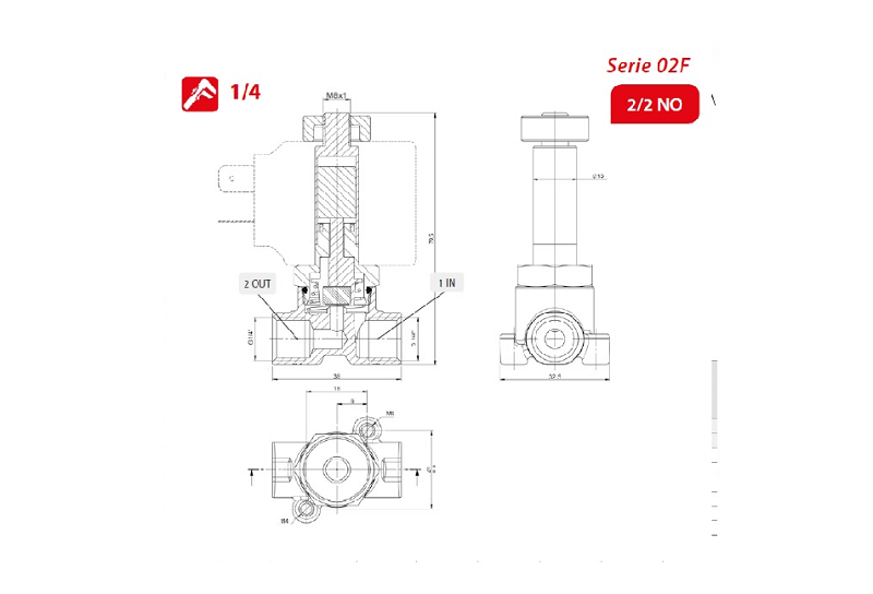 Priamo riadený ventil s funkciou 2/2 NO (2 úlohy, 2 cesty, v základnom stave otvorený ventil - 1 IN>2 Out). Základná, mechanická časť "Solenoidu priem. 13 mm" je určená pre rovnaký priemer otvoru cievky 13 mm. Voľba typu ventilu: D* - Prietok média je tiež konštrukčne obmedzený vŕtaním "1 IN" [mm], maximum bez obmedzenia uvádza tabuľka prietoku. Ovládaním elektrického solenoidu sa prietok znižuje podľa príkonu až do jeho minima. Hodnoty delta prietoku a delta tlaku podľa rôznych príkonov cievky je možné vyhľadať v originálnom katalógovom liste výrobcu, alebo ho na požiadanie zašleme. Riedke médiá: Maximálna viskozita média je uvádzaná 53 cSt.
