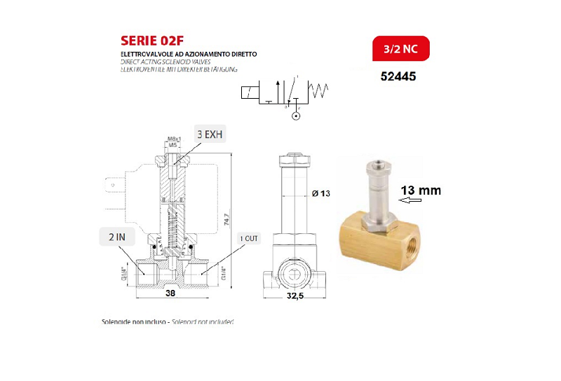 Priamo riadený ventil s funkciou 3/2 NC (3 úlohy, 2 cesty, v základnom stave zatvorený ventil). Základná, mechanická časť "Solenoidu priem. 13 mm" je určená pre cievku rovnakého priemeru otvoru "13 mm". V základnom stave "NC" je prietok média obmedzený otvorom za závity "2 IN" [mm]. Ovládaním elektrického solenoidu sa prietok zväčšuje do jeho maxima, ktoré je v tabuľke uvedené ((vo farebnom (inom) odlíšení). Hodnoty delta prietoku a delta tlaku je možné vyhľadať v originálnom katalógovom liste výrobcu. Výber cievok: Podstatným údajom pri výbere solenoidu je prietok, vŕtanie a sila cí. riadi otvorenie do max. výtupu (1 OUT), kde je pre všetky typy rovnaké vetranie 1,9 mm, viď originálny katalóg Riedke médiá: Maximálna viskozita média je uvádzaná 53°.