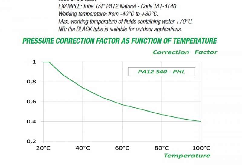 * - D = vonkajší kalibrovaný priemer hadice. Parametre uvedené v tabuľke sa vzťahujú k teplote 23°C. Ďalšie rozmery viď. AEROTEC PA-12 TRANS.S40 PH artikel 10697 (niektoré bez normy), viď. katalógový list výrobcu.