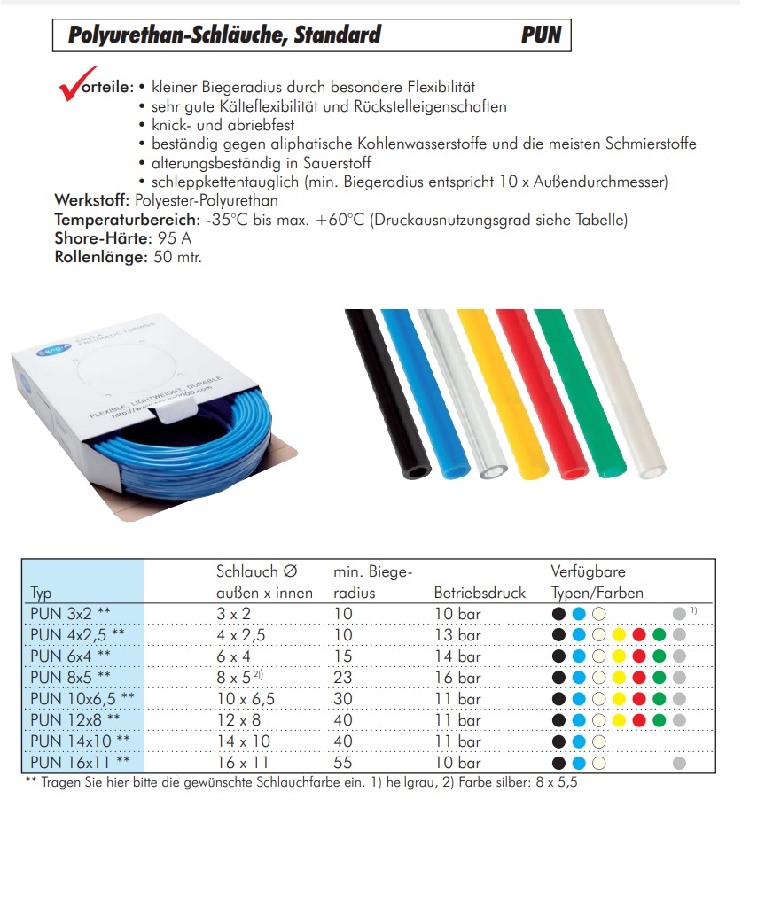 PU kalibrovaná hadička pre dopravu stlačeného vzduchu, olejov. Na prianie zákazníka dodávame k hadiciam špeciálne spojky a rýchlospojky. Pri hadici je presne kalibrovaný vonkajší priemer, ktorý je najdôležitejší pri objednávaní hadice. Všetky parametre uvedené v tabuľke sú pri 20°C. Vyššia teplota má za následok zníženie prevádzkového tlaku.