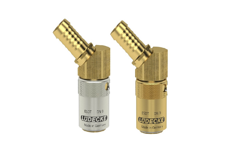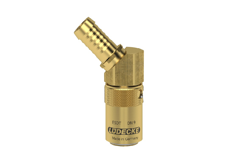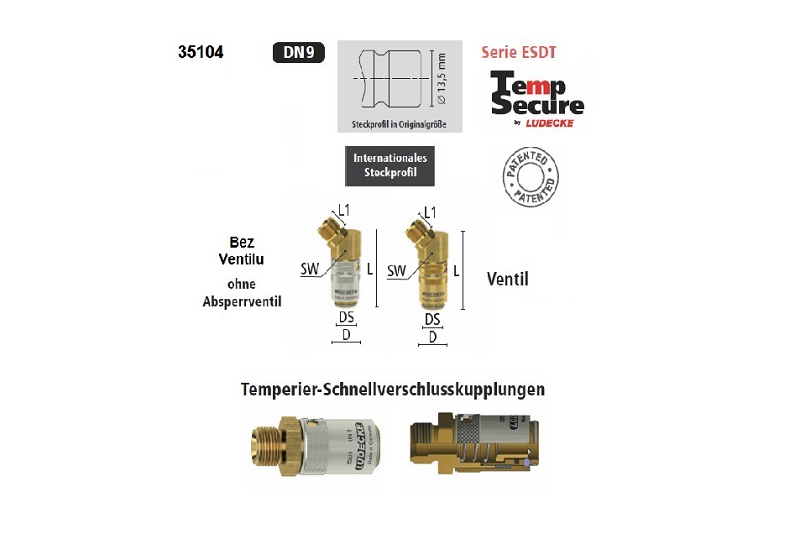 ALM - Automatický zaisťovací mechanizmus (Automatic Locking Mechanism) - patent Lüdecke. Temperovacie rýchlospojky Séria ESDT DN 9 s veľkosťou priemeru čapu 13,5 mm z mosadze 2.0401. Pre aplikácie regulácie teploty s horúcou alebo studenou vodou a temperovaným olejom. Najbezpečnejšie a najžiadanejšie rýchlospojky v plastikárskom priemysle (práca s horúcimi médiami). Oproti zaisteniu typu S, (napr. séria ESD alebo ESDF) dostávajú prednosť najmä kvôli bezpečnostnej napr. v hustej prevádzke s horúcimi olejmi (horúcou vodou). Verzia s prídavným tesnením O-krúžkom na pripojovacom porte, aby sa zabránilo úniku pri vysokoteplotných aplikáciách. Pre spojenie so zástrčkou radu ESD DN 9. Systém ESD je plne kompatibilný s americkým systémom DME 3/8", nie Hasco.