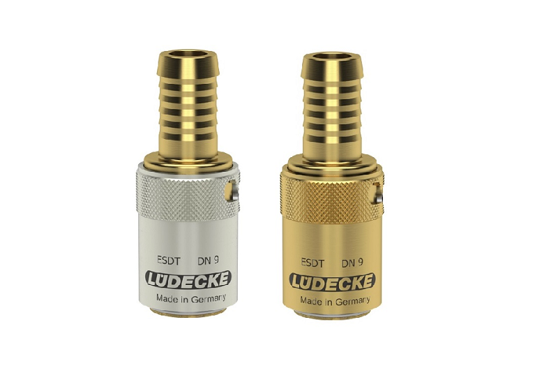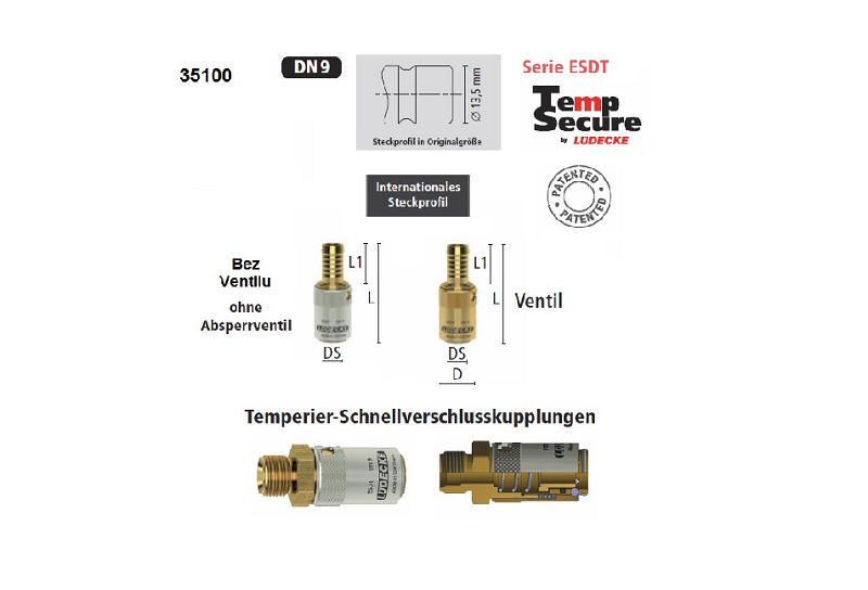 ALM - Automatický zaisťovací mechanizmus (Automatic Locking Mechanism) - patent Lüdecke. Temperovacie rýchlospojky Séria ESDT DN 9 s veľkosťou priemeru čapu 13,5 mm z mosadze 2.0401. Pre aplikácie regulácie teploty s horúcou alebo studenou vodou a temperovaným olejom. Najbezpečnejšie a najžiadanejšie rýchlospojky v plastikárskom priemysle (práca s horúcimi médiami). Oproti zaisteniu typu S, (napr. séria ESD alebo ESDF) dostávajú prednosť najmä kvôli bezpečnostnej napr. v hustej prevádzke s horúcimi olejmi (horúcou vodou). Verzia s prídavným tesnením O-krúžkom na pripojovacom porte, aby sa zabránilo úniku pri vysokoteplotných aplikáciách. Pre spojenie so zástrčkou radu ESD DN 9. Systém ESD je plne kompatibilný s americkým systémom DME 3/8", nie Hasco.