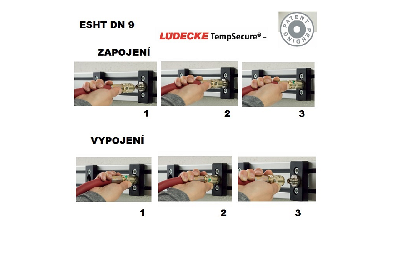 Rýchlospojky určené pre plastikárske stroje a formy s patentovaným automatickým bezpečnostným zaisťovacím mechanizmom. Pre aplikácie, kde je potrebné udržanie stálej teploty horúcou a studenou vodou, poprípade temperovacím olejom. Kompatibilný s Hasco Z8. Pripojovacie časti, ventilové telo, ventil, vsuvky z mosadz MS 58/materiál 2.0401.Pružiny a rozperný krúžok z nerezovej ocele 1.4310, guľa - nerezová oceľ 1.4034, tesnenie: Viton. Rozmer čapu vsuvky 13 mm. Jednoručný systém spojenia umožňuje veľmi jednoduché a rýchle spojenie rýchlospojky s protikusom (s hadicou a koncovkou). Temp Secure (bezpečnostný patentovaný systém výrobcu Lüdecke) - význam je v zabránení náhodnému rozpojeniu, cieľom je zabezpečenie. Sériu DN 9 sú vďaka tvarom a spôsobu rozpájania 2 typy zaistenia 1. Tvar Z a 2. voliteľnou požiadavkou zaistenia "S". Kombinovaná tlakovo torzná pružina a zosilnené uvoľňovacie puzdro z vysoko odolnej špeciálnej mosadze. Voliteľne s priamymi, jednoduchými alebo dvojitými uzatváracími ventilmi, pre spojenie so zástrčkou radu ESH DN 9. Pre rok 2022 výrobca Lüdecke doplnil rad o farebne svietiace doštičky, viď video pri sekcii. Kody sú v prípade tohto prevedenia ESHT* zmenené na ESHTC*.