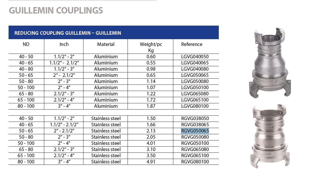 GUILLEMIN - symetrické bajonetové spojky sú určené na transport a prepravu kvapalných aj sypkých látok a granulátov napr. silá, cisterny vagónov, poľnohospodársky a chemický priemysel. Konštrukcia spojky je francúzsko-belgického pôvodu a zodpovedá norme EN 14420-8 / NF E 29-572. Identické polovice spojky s dvoma západkami sú spojené medzi sebou priložením tesniacich plôch k sebe a následným otočením oboch uzatváracích prstencov tak, aby zapadli do západiek. Na utiahnutie je potrebné použiť hákový kľúč Guillemin. Materiál - hliník, Štandardné tesnenie (NBR) Buna (čierna). Nie sú vhodné pre plyny a paru. Na prianie možnosť dodať v mosadznom prevedení.