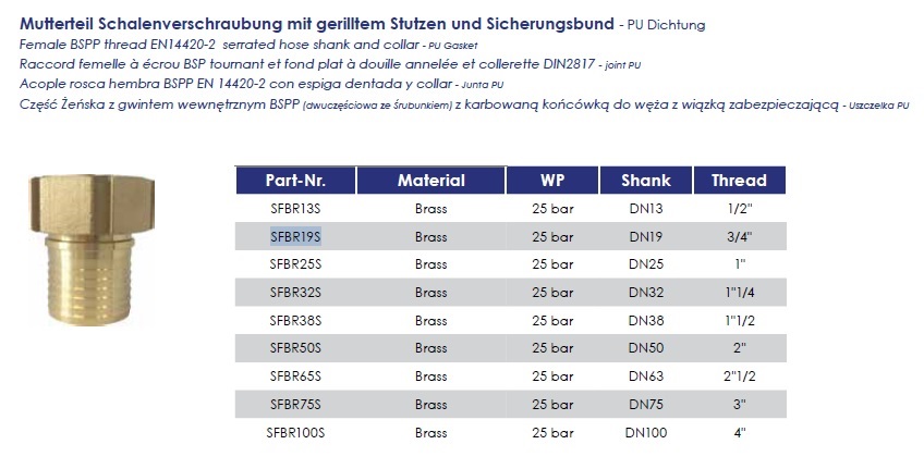 | Nákupný kód | DN | Vnútorný závit | Pracovný tlak | Hadica d / D | Hmotnosť | Balenie | |