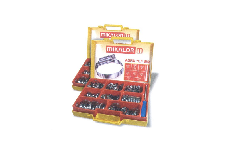 Box so skrutkovacími sponami. Materiál W1 a W2 šírka pásky 9 mm: 8-16 mm (60 ks), 12-22 (40 Ks), 16-27 (40 ks), 20-32 (20 ks), 30-45 (20 ks), 32-50 (10 ks), 40-60 (10 ks), 50-70 (6 ks). Boxy na sortiment ASFA L (9 mm) a ASFA S (12 mm) sú ideálne pre všetky vaše potreby hadicových svoriek. Tento rad sortimentných krabíc pokrýva všetky dostupné vlastnosti materiálu. Robustné plastové puzdro je tiež veľmi vhodné na prepravu produktu a znamená, že máte vždy k dispozícii najčastejšie používané rozmery. Vložka obsahuje informácie o umiestnení každého priemeru vo vnútri krabice. Každá krabička obsahuje flexibilný šesťhranný skrutkovač, ktorým je možné utiahnuť spony. Na dopyt možný box aj z materiálu W4, W5 šírka pásky 9 mm (rovnaké rozmery a množstvo). Na dopyt možný box aj z materiálu W1, W2, W4 šírka pásky 12 mm (iné rozmery a množstvo). Na dopyt možný box aj z deformačnými sponami Ear Clip s dvoma uškami W1 alebo W4.