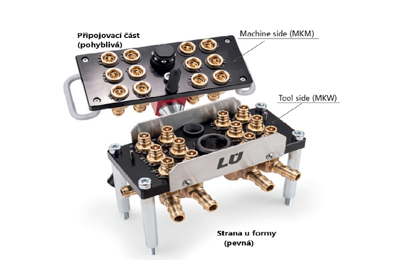 Pre aplikácie s reguláciou teploty s horúcou alebo studenou vodou a taktiež temperovaným olejom. Multi-spojkový systém umožňuje pripojiť niekoľko okruhy regulácie teploty v jednom kroku. MKMF je profil Francúzsky - Staubli (na konci kódu F). Teplota v závislosti od média: (olej: +200 °C, voda: +150 °C, vzduch: +200 °C). Nástrojová strana dvojdielneho viacspojkového systému. Vďaka modulárnej konštrukcii je možné zostaviť každú multispojku a konfigurovaný individuálne, a preto je dokonale prispôsobený akejkoľvek požiadavke a aplikácii. Výhody: Rýchle a súčasné pripojenie niekoľkých teplôt regulačnej linky. Pomocou páky ľahko a rýchlo pripojíte a odpojíte systémy. Zvýšená bezpečnosť a účinnosť: žiadne riziko zámeny spojov/hadíc, skrátená doba vybavovania. Jednoduchá obsluha, robustný, vysoko kvalitný, odolný proti úniku. Môžete vybrať medzi verziou so 6, 12 alebo 20 pripojeniami. Taniere je možné objednať aj v červenej alebo modrej farbe.