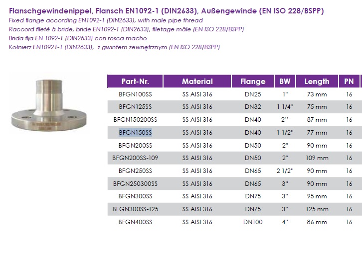 PRÍRUBA PN16/SS TŔŇ AG - Pevná, EN10921-1, nerezová s hadicovým tŕňom a vonkajším z. BSPP.