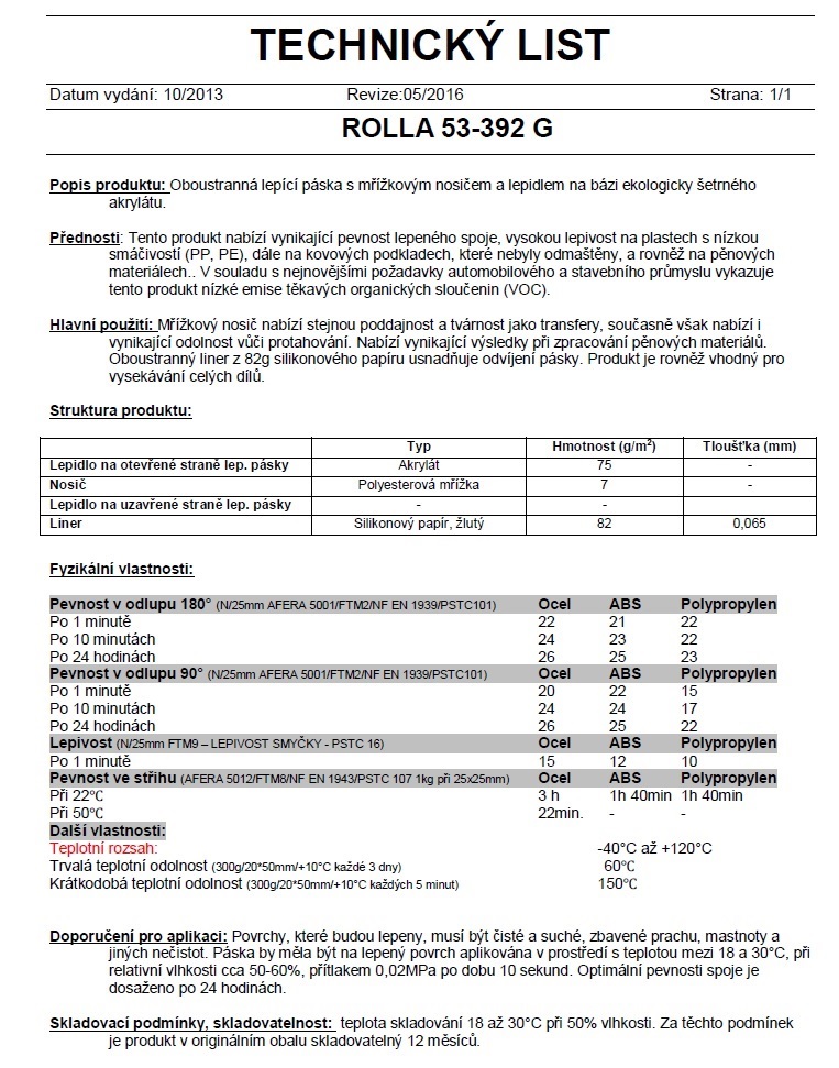 Na predaj iba celej rolky. Návod na použitie: Povrchy, ktoré budú lepené, musia byť čisté a suché, zbavené prachu, mastnoty a iných nečistôt. Páska by mala byť na lepený povrch aplikovaná v prostredí s teplotou medzi 18 a 30° C, pri relatívnej vlhkosti cca 50-60%, prítlakom 0,2 bar po dobu 10 sekúnd. Optimálna pevnosť spoja je dosiahnutá po 24 hodinách. Doska s mriežkou: Mriežkový nosič ponúka rovnakú poddajnosť a tvárnosť ako transfery, súčasne však ponúka aj vynikajúcu odolnosť voči naťahovaniu a pri spracovaní penových materiálov. Obojstranný liner z 82g silikónového papiera uľahčuje odvíjanie pásky. Skladovacie podmienky, skladovateľnosť: teplota skladovania 18 až 30° C pri 50% vlhkosti. Za týchto podmienok je produkt v originálnom obale skladovateľný 12 mesiacov. Ponúkame: lepenie expandovaných dosiek z materiálu EPDM, Silikónu a pod. Možno použiť aj pre kompaktné gumy, vhodné kontaktovať našu výrobu.