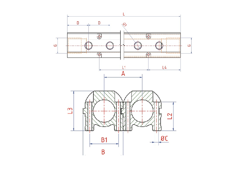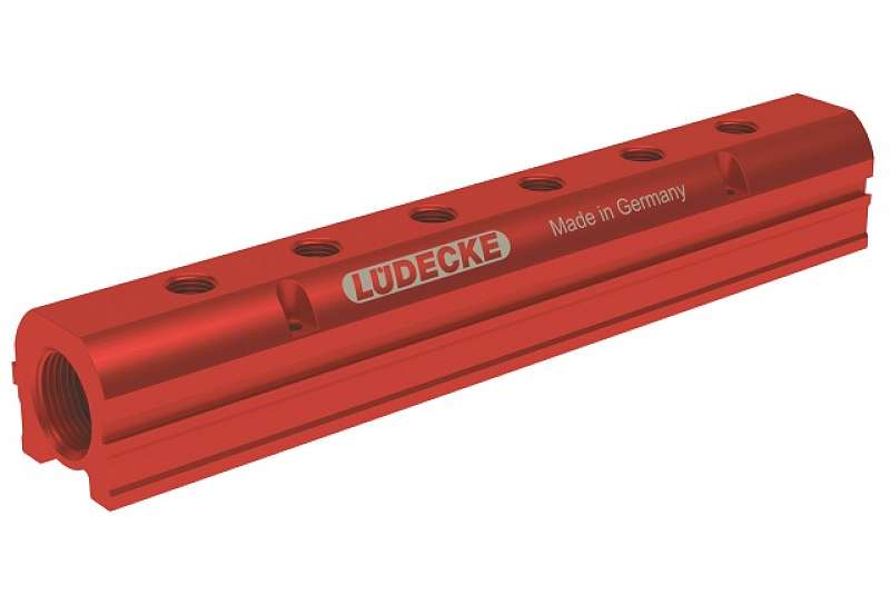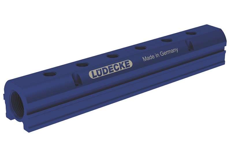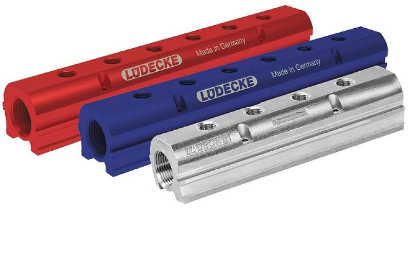 Rozdeľovacie bloky z modrého alebo červeného eloxovaného hliníka na jasné určenie média a jednoduché pripevnenie na formu alebo výrobné zariadenie. Určené pre plastikárske stroje a formy s vedením horúcej a studenej vody, temperovacích olejov. Pre čisté usporiadanie prítoku a odtok k nástroju na reguláciu teploty, je možné namontovať na stroj. Zvyšuje bezpečnosť práce a výroby čistým usporiadaním vedenia regulácie teploty, šetrí energiu. Centrálny prívod a výstupy v potrebnom počte, modulárna konštrukcia na bočné spojenie blokov k sebe. Hlavný bočný prívod G 3/4", výstupy so závitmi G 1/4" na montáž rýchlospojok radu DN6 a DN9.