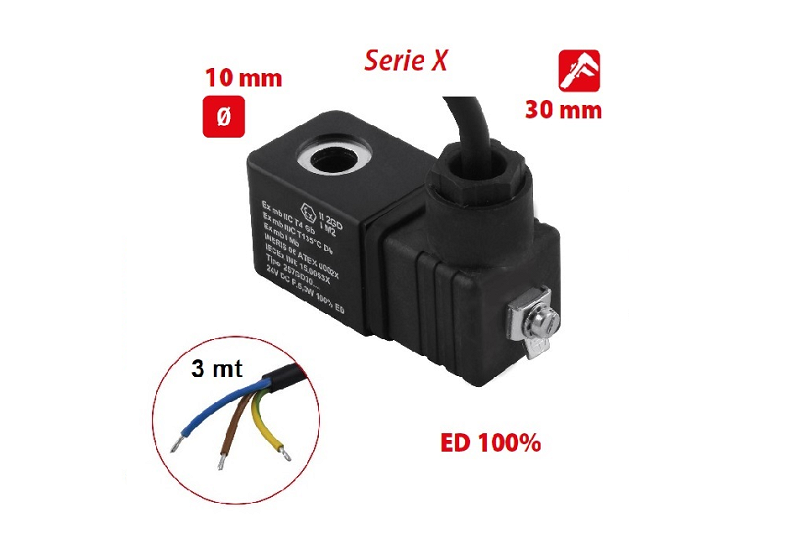 3 pinové kolektory, 3 m farebných káblov. Trieda klasifikácie cievky: H podľa EN 60085, tiež ATEX II 2D Ex mb IIIC T135 ° C Db. Ostatné normy a špecifikácie viď katalóg (obrázky pri výrobku). Spojenie so solenoidmi je voliteľné viď tiež referencie cievok ... XB, X1, X2, X3
