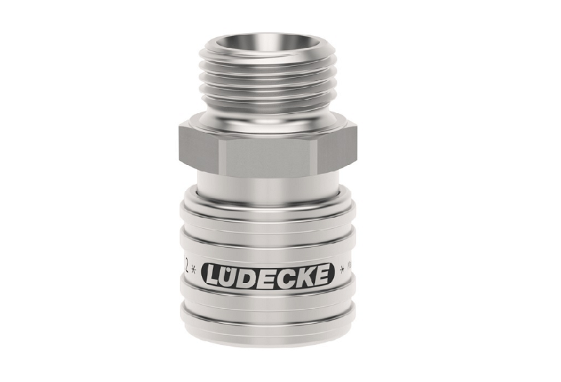 Rýchlospojka z nerezovej ocele 1.4305 s vonkajším závitom, séria Dn 7,2 jednostranne uzatvárateľná. Nerezové rýchlospojky tejto série ESE DN 7,2 majú priemer nasadzovacieho čapu 12 mm. Rýchlospojka s ergonomickou objímkou - vrúbkované majú lepší úchop a nešmýkajú sa. Na prívod stlačeného vzduchu pri zvýšenej čistote a hygienických predpisoch alebo pri doprave rôznych médií (plyny, chemikálie, laky, farmaceutiká). Niekoľko oblastí použitia vo farmácii, chemickom priemysle, lekárskej technike, potravinárskom priemysle, čistých priestoroch aj pre sofistikované pneumatické aplikácie. Rýchlospojky majú prietok 1150 l/min aj pri nízkom tlaku a majú minimálny odpor prietoku. Možnosť na objednanie aj rýchlospojky pre kvapaliny obojstranne uzatvárateľné (-AAB). Materiál: Teleso, objímka, telo ventilu, ventil, kolíky, kolko: nerezová oceľ 1.4305. Pružiny, poistný krúžok: nerezová oceľ 1.4310, tesnenie FKM (Viton).