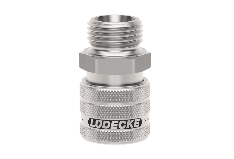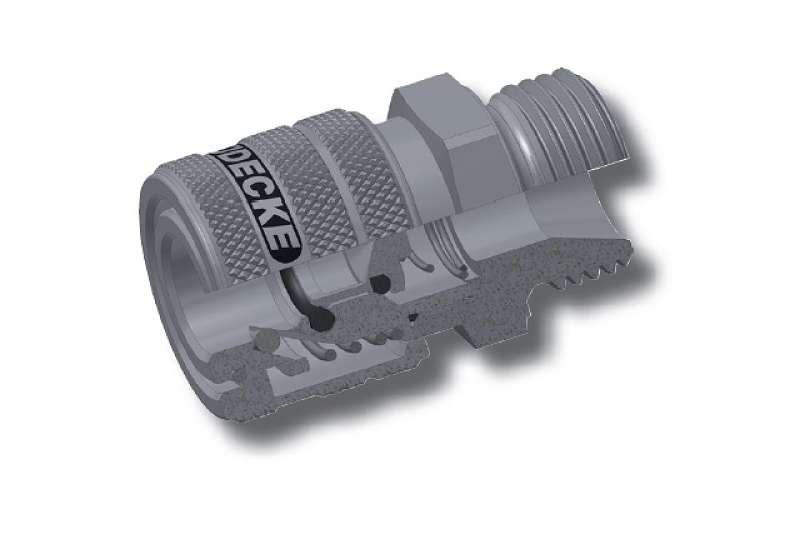 Rýchlospojka z nerezovej ocele 1.4305 s vonkajším závitom, séria Dn 7,2 jednostranne uzatvárateľná. Nerezové rýchlospojky tejto série ESE DN 7,2 majú priemer nasadzovacieho čapu 12 mm. Rýchlospojka s ergonomickou objímkou - vrúbkované majú lepší úchop a nešmýkajú sa. Na prívod stlačeného vzduchu pri zvýšenej čistote a hygienických predpisoch alebo pri doprave rôznych médií (plyny, chemikálie, laky, farmaceutiká). Niekoľko oblastí použitia vo farmácii, chemickom priemysle, lekárskej technike, potravinárskom priemysle, čistých priestoroch aj pre sofistikované pneumatické aplikácie. Rýchlospojky majú prietok 1150 l/min aj pri nízkom tlaku a majú minimálny odpor prietoku. Možnosť na objednanie aj rýchlospojky pre kvapaliny obojstranne uzatvárateľné (-AAB). Materiál: Teleso, objímka, telo ventilu, ventil, kolíky, kolko: nerezová oceľ 1.4305. Pružiny, poistný krúžok: nerezová oceľ 1.4310, tesnenie FKM (Viton).
