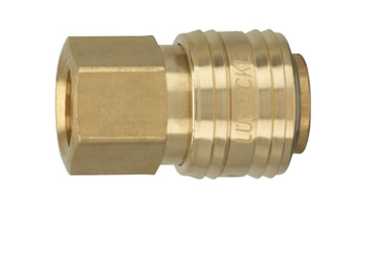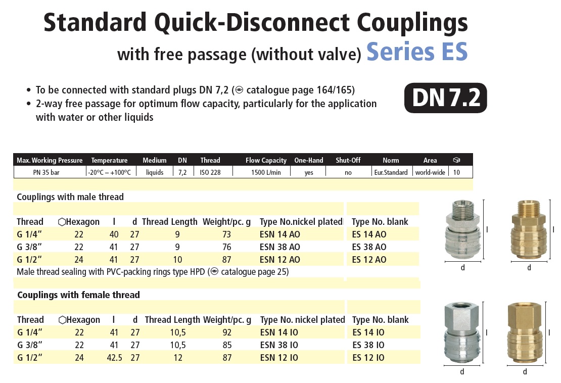 Rýchlospojky série ESN DN 7,2 sú plne kompatibilné aj s sériou ESE (nerez), majú rovnaký čap 12 mm aj DN 7,2. Rýchlospojka nemá ventil, po rozpojení môže médium unikať späť. Univerzálne rýchlospojky z mosadze MS 58 poniklované. Robustné, bezpečné a spoľahlivé, pripojenie so zástrčkou DN 7.2. Tvar objímky, aby sa zabránilo kontaminácii spojky. Priamy prietok pre optimalizovanú prietokovú kapacitu, najmä na aplikáciu vodou alebo inými kvapalinami. Pre stlačený vzduch, priemysel, rovnako ako pre vodu a ďalšie médiá. Materiály: telo, puzdro: mosadz MS 58 poniklovaný, pružina, prídržný krúžok: Nerezová oceľ 1.4310, O-krúžky: Buna NBR (EPDM a FKM na vyžiadanie), mosadz MS 58 poniklovaná oceľ pozinkovaná.
