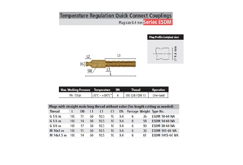 Rýchlospojky určené pre plastikárske stroje a formy s voľným priechodom. Na aplikácie udržanie stálej teploty horúcou a studenou vodou, poprípade temperovacím olejom. Výrobok je možné upraviť na vlastnú dĺžku podľa potreby, na to slúžia miesta perforácie (zoslabenie).