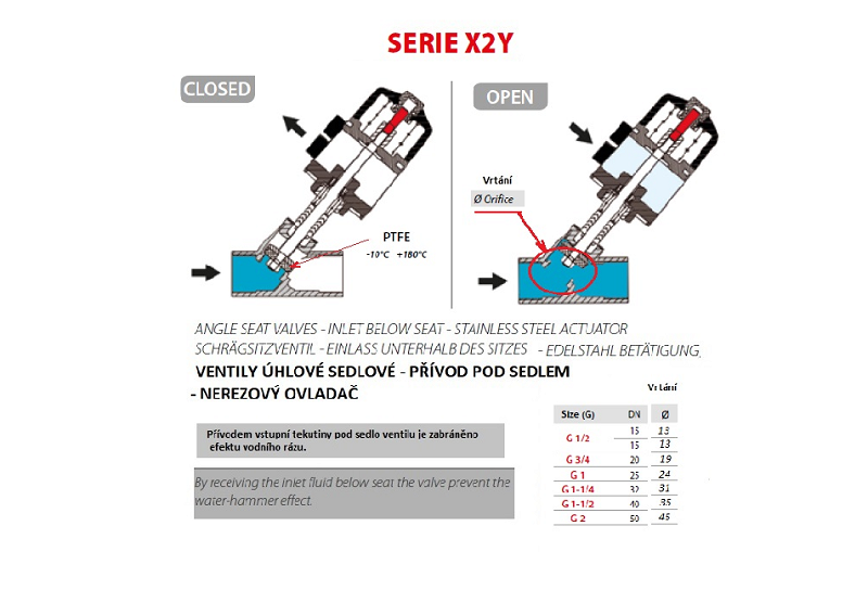Piest vo vnútri pohonu je mechanicky spojený k uzáveru cez driek, ktorý umožňuje otvorenie alebo uzavretie hlavného otvoru v telese ventilu pre priechod tekutiny. Pri neprítomnosti riadiaceho tlaku zostáva ventil v uzavretej polohe vďaka pružine. Prívodom vzduchu do riadiaceho vstupu sa ventil sa otvorí. Ventily s uhlovým sedlom radu X2Y zaručujú veľký prietok, nízke trenie a zabránenie vodnému rázu vďaka vstupu prietoku pod sedlom. Viskozita kvapalín tohto výrobku je uvádzaná v hodnote 600 l/hod. (cSt) pre všetky DN.