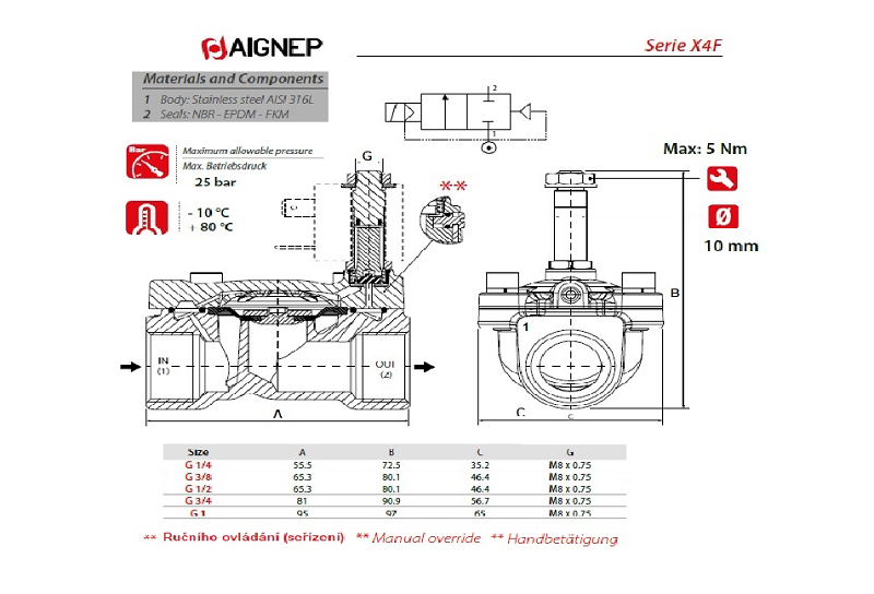 Tieto ventily X4F 2/2 NC majú jednu cestu a dve úlohy. Typ NC - sú v základnom stave zatvorené. Po zapojení a spustení prúdu je membránou otvor otvorený. Vyrábajú sa štandardné 2 série, na ktorých môžete filtrovať: H= bez nastavenia a štandardnou membránou 0 = ručné nastavenie a štandardná membrána Séria = kódy majú toto písmeno alebo číslo na poslednej pozícii viď originálny katalógový list. Maximálny prevádzkový tlak je 25 barov. V tabuľke je uvedené max. rozpätie tlaku ΔP-AC 5,3 W (triedavý - sol. 10 mm). Na dopyt sú ponúkané tieto špeciálne prevedenia: -Verzia vhodná na použitie s priemyselným kyslíkom.